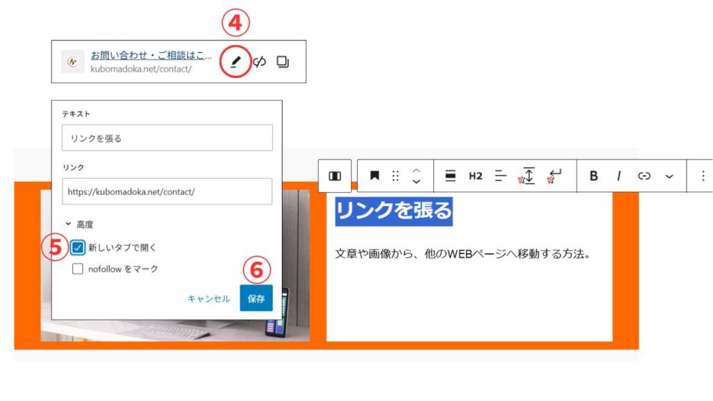 ⑤『新しいタブで開く』にチェックを入れる